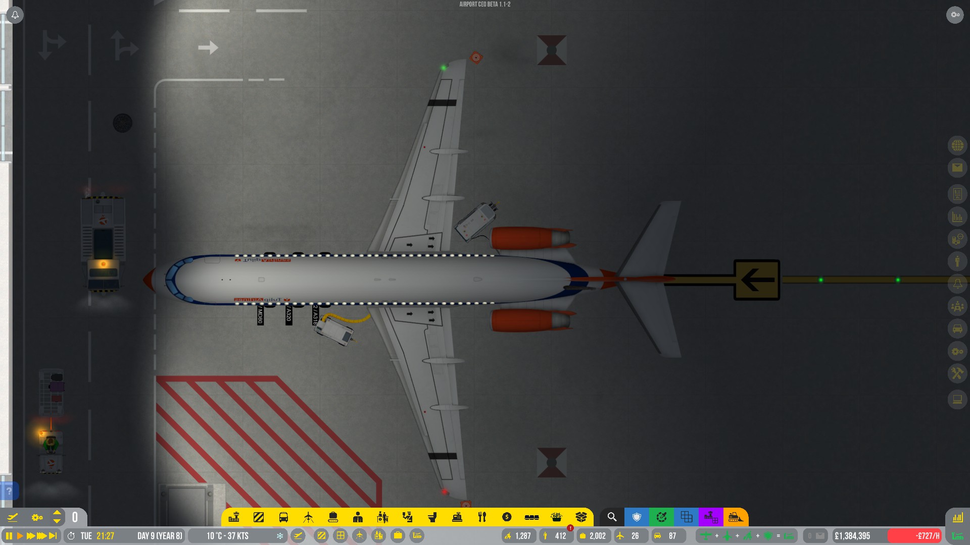Why not add a mid game R&D for Runway assignment. I agree with the sentiment that in early game what runway an aircraft chooses is not critical. But when you start to have more departures and landings this becomes a major aspect of what you will want to manage. Especially during winter and de-icing. I think that that the standard, beginning system, should weigh in distance to active runway as well as queuing aircrafts at runways. The planes “chooses” the runway with the lowest accumulated value from theese two parameters. In Mid game, say somewhere between medium and large aircrafts you can choose to initiate a R&D project that will let you micro manage this aspect if you want. I’m thinking that if you select a runway. you can from the menu choose what gates will use it. A simple tick-box system will work. each box will be a gate that is connected to the runway in question. Ofc there will need to be some kind of warning if a gate does not have a choosen arrival or departure runway. (if the CEO unticks all boxes for example). If you don’t make any changes the airport operates as before, within the standard parameters. As Olof use to say, Easy if you like, Hard if you want? Maybe the R&D can be called “Advanced Ground Operations”?