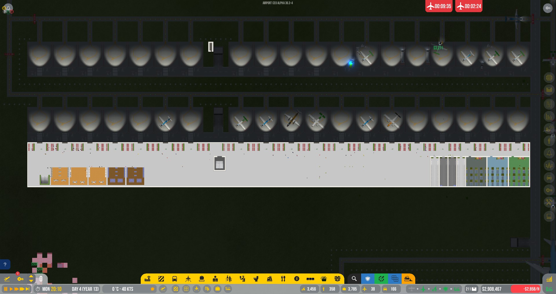 Realize, this is an expert game, with broken event cooldown timers on the Oil Crises, Economy Crashes, Pandemic and Vulcanos. Which are running on my field non stop. Also, I disabled night fligths to cope with the bouncing flights of Volcanos. So, this is just daytime production.